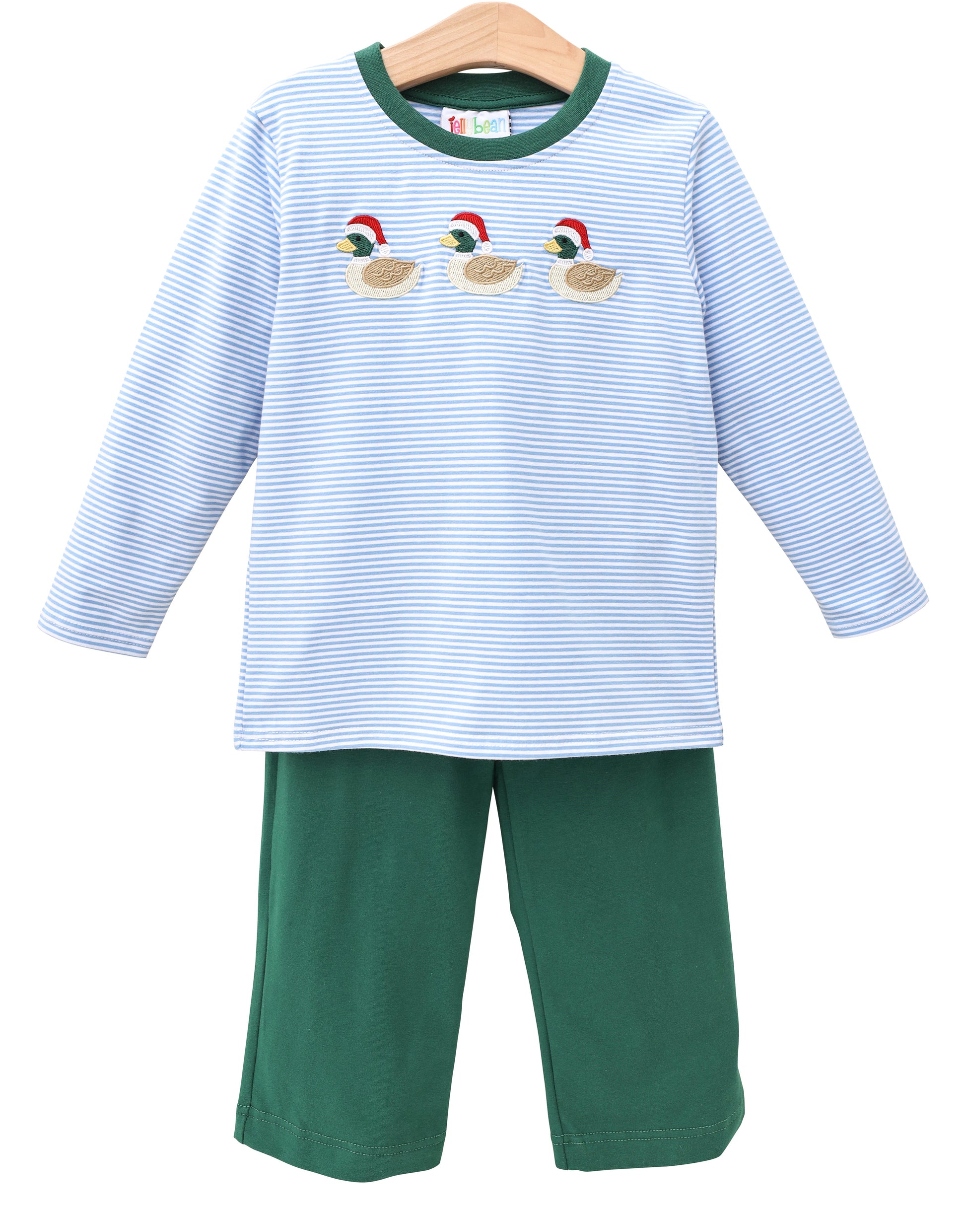 Get ready for festive fun with the Holiday Hunt Pants Set! This playful outfit features a cozy blue striped top paired with vibrant green pants. Adorned with an adorable embroidered trio of mallard ducks sporting Santa hats, it’s perfect for spreading holiday cheer in style and comfort.