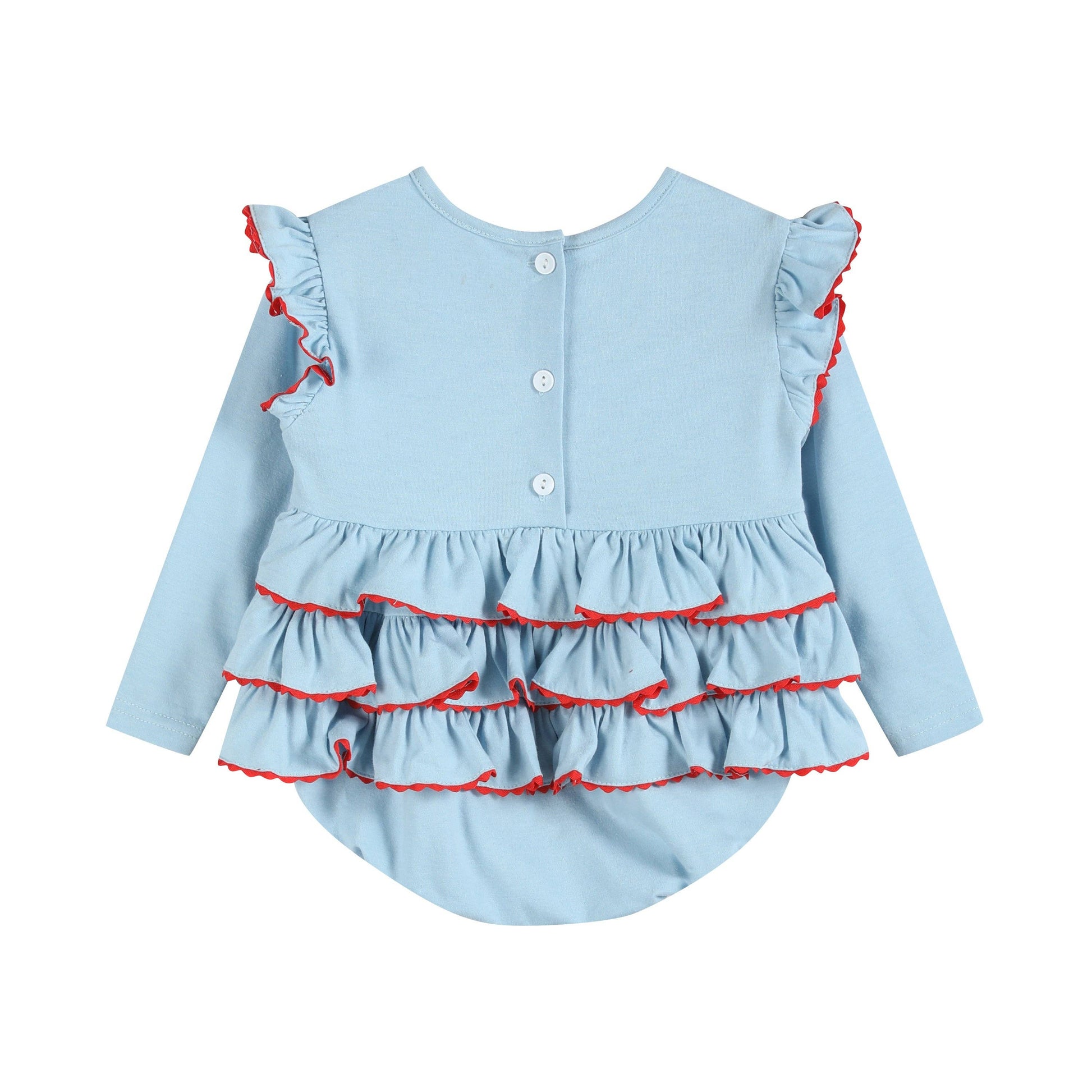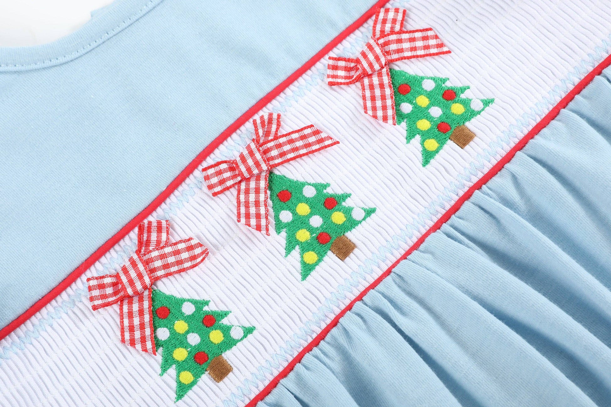 Jingle all the way with our Light Blue Christmas Tree Smocked Knit Ruffle Romper! Decked out with smocking and festive embroidered Christmas trees with little bows, this romper brings holiday cheer to your little one's wardrobe. Snaps at the crotch allow for easy and quick diaper changes. The ruffle bottom adds a fun and cheerful touch. It's the perfect one-piece wonder for festive frolics and Christmas cuddles.