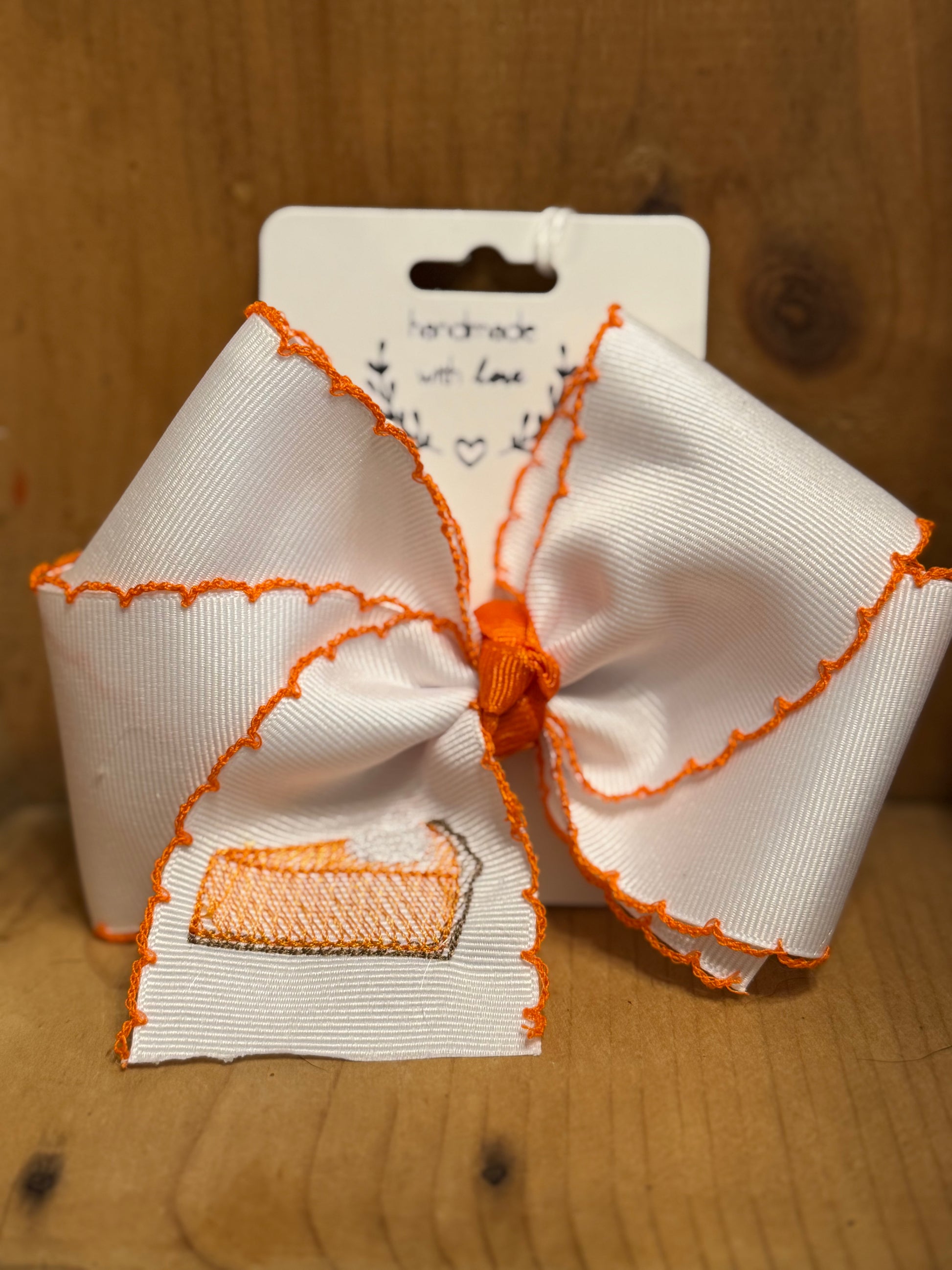 5-6” handmade grosgrain bow with moonstitch edges, complete with a sweet piece of pumpkin pie embroidery!